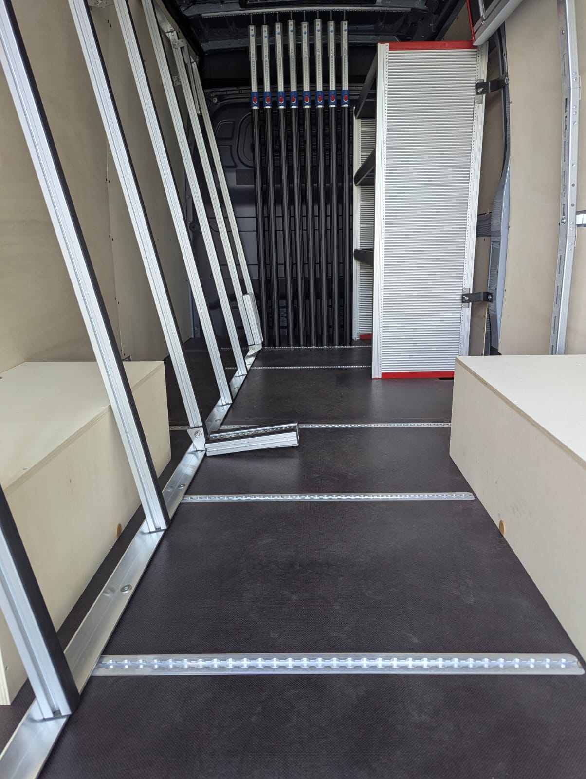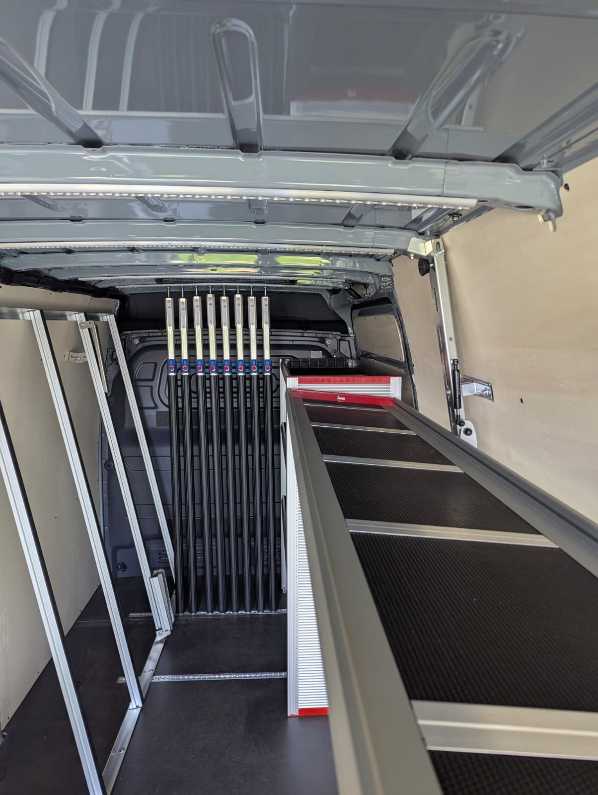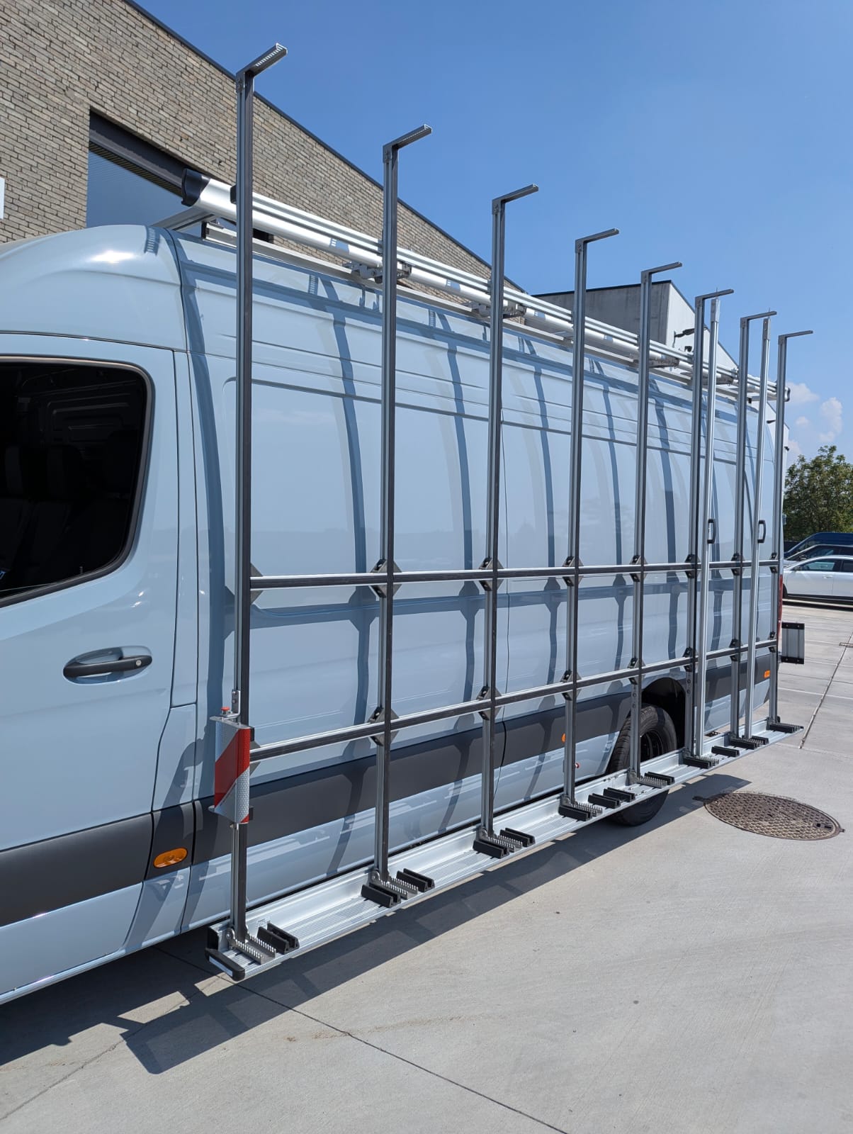 Ce Sprinter a été entièrement équipé d’un débris de verre à l’intérieur et à l’extérieur, en combinaison avec une galerie de toit, un marchepied et des porte-bagages GEMA. Le fourgon a également été équipé à l’intérieur d’un onduleur, d’un éclairage intérieur supplémentaire et d’un assortiment de barres de fixation pour sécuriser le chargement.