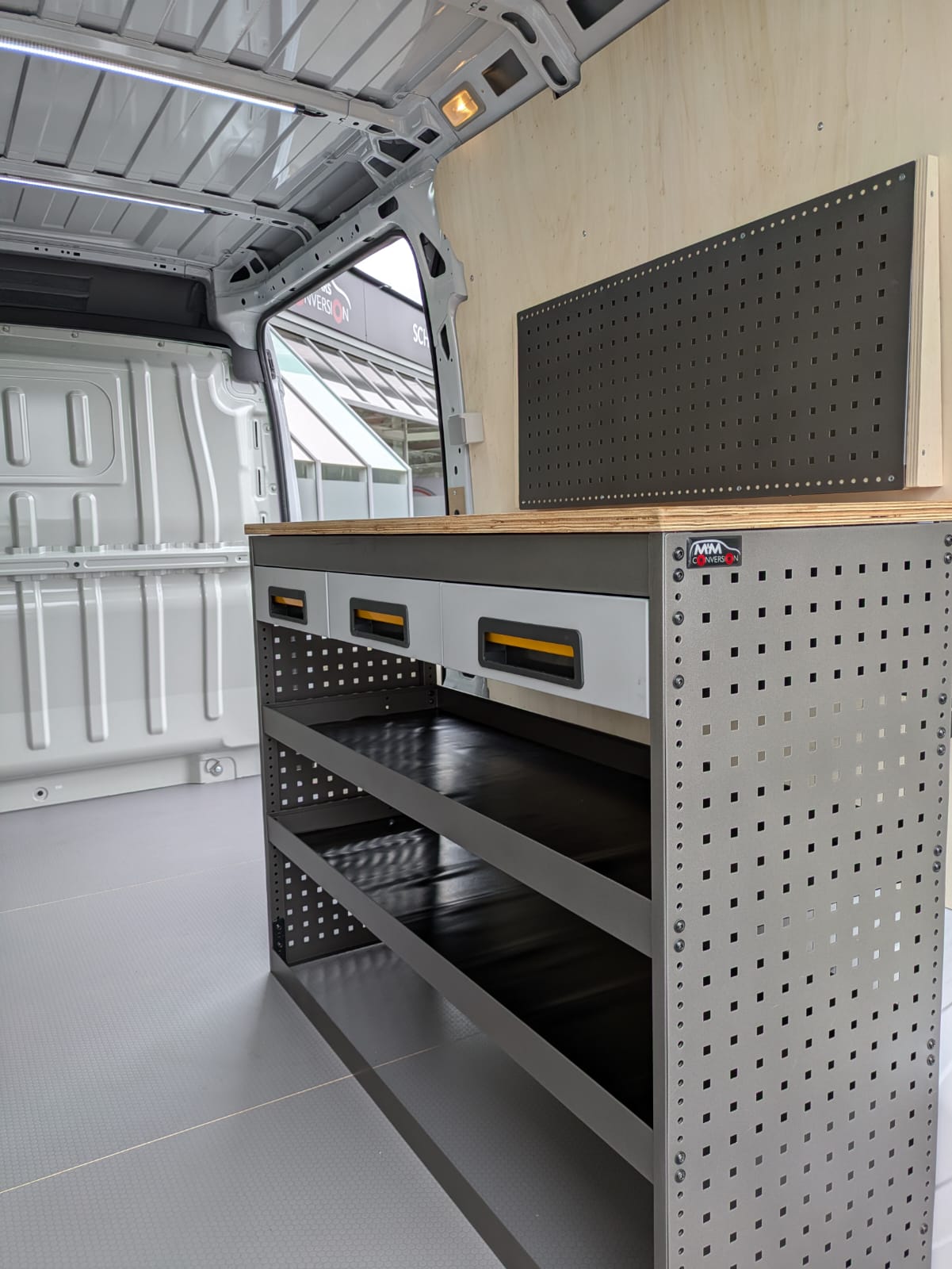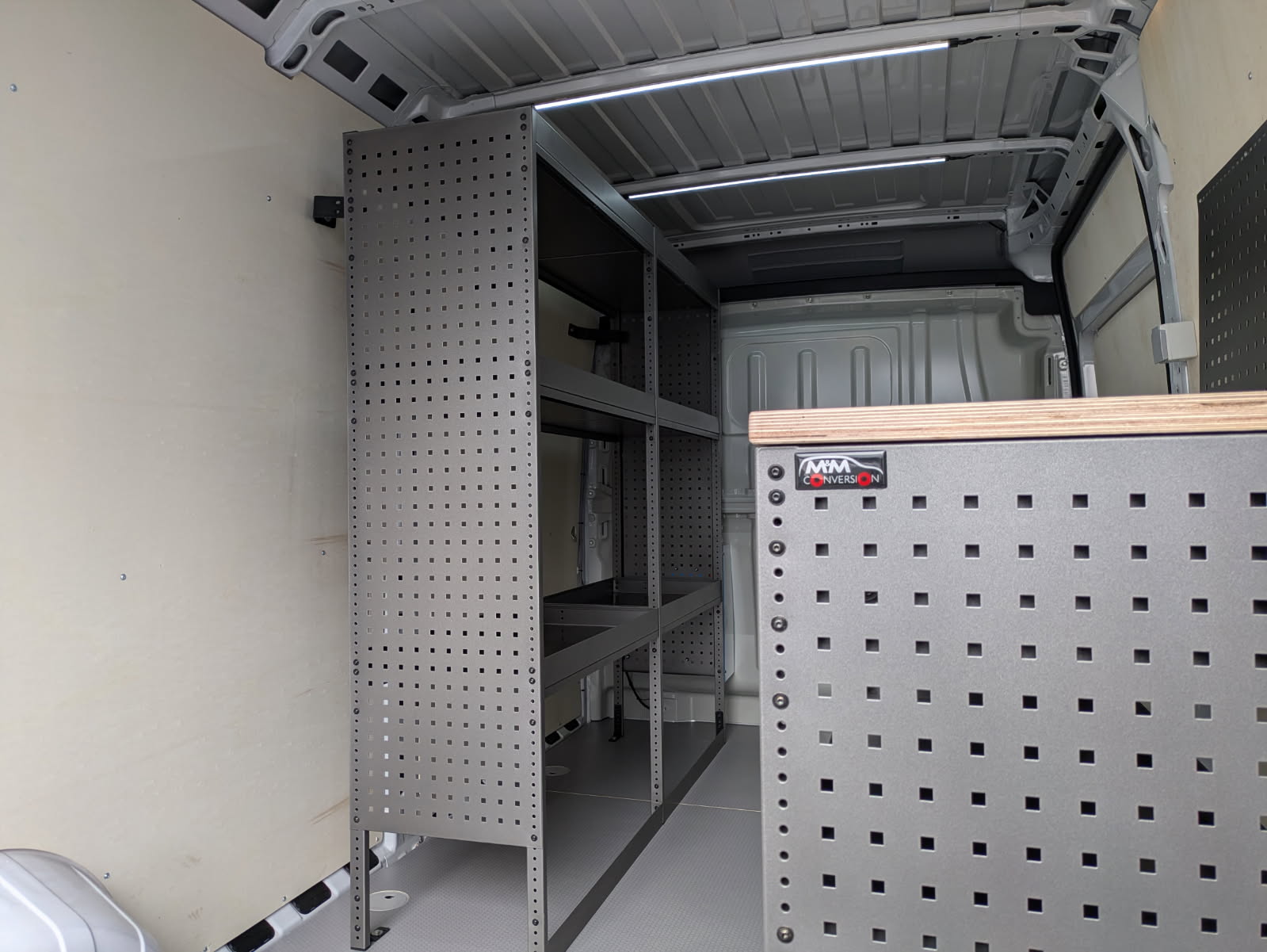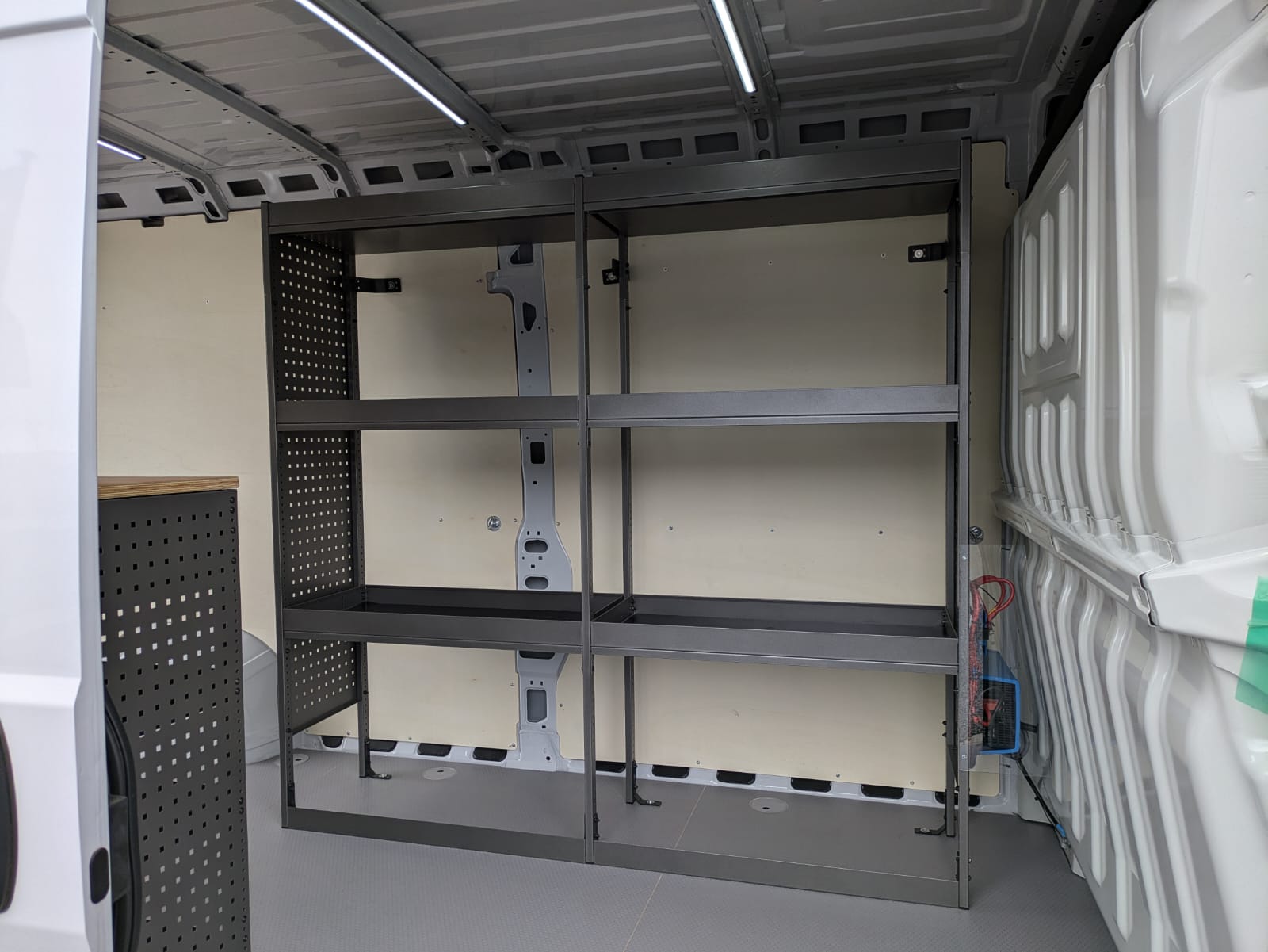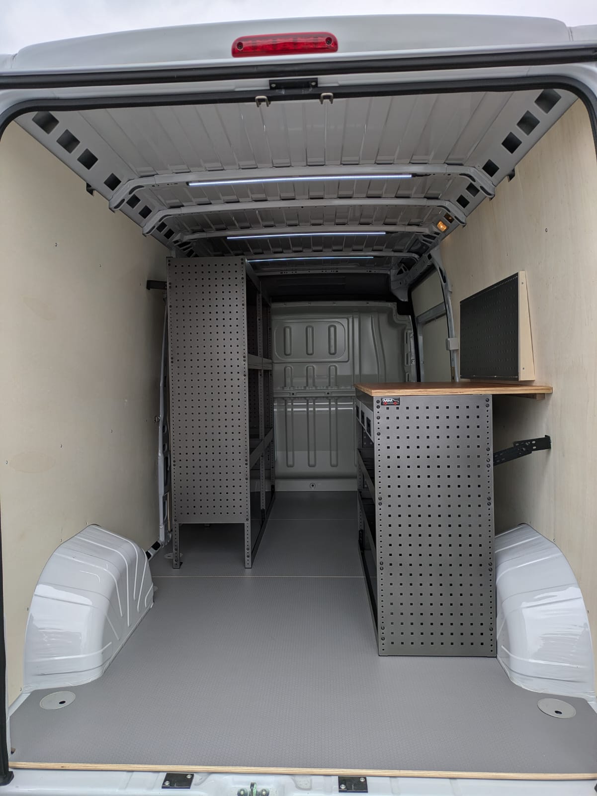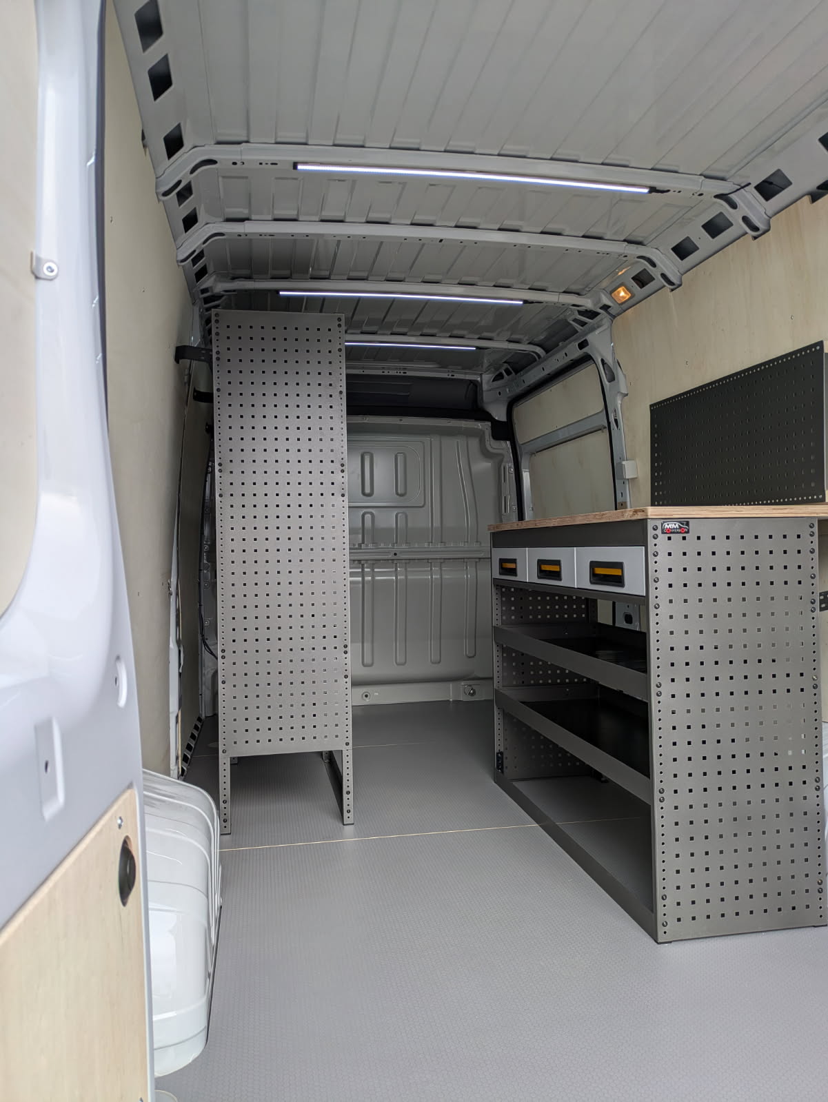 Deze bestelwagen werd voorzien van een hexaline grijskleurige vloer in combinatie met multi-8mm zijwanden. Daarnaast werd de bestelwagen ingericht met een inrichting van BOB-SYSTEM op maat voor de klant in combinatie met een werktafel. Ook werd de bestelwagen voorzien met ledverlichting over de volledige laadruimte en een omvormer van Victron.